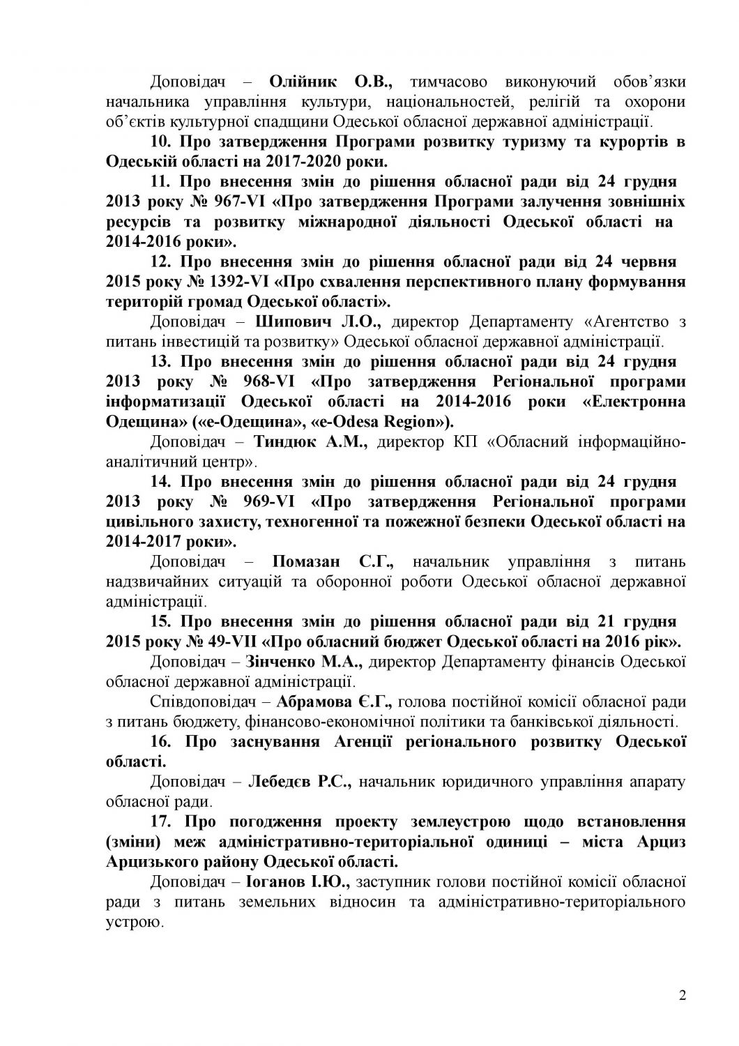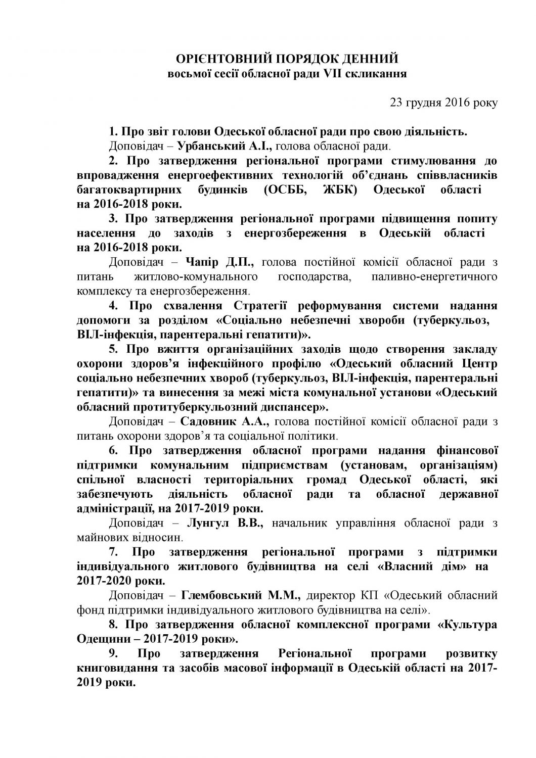 Согласно предварительной повестке дня, депутатам предложат рассмотреть проект бюджета на 2017 год, а также внести изменения в решение областного совета от 21 декабря 2015 года «Об областном бюджете Одесской области на 2016 год».