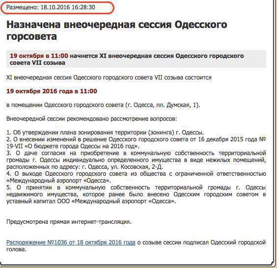 Согласно сообщению пресс-службы горсовета, распоряжение о созыве сессии 18 октября подписал мэр Одессы Геннадий Труханов.