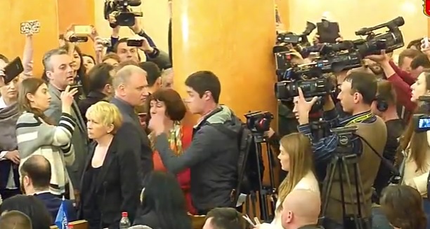 12:12 Присутствующие возмущаются, Труханов просит "молодого человека" выйти из зала. Устименко выводят, происходит потасовка. Слышны крики, в толпе видна нардеп Светлана Залищук, она уговаривает охрану прекратить такие действия