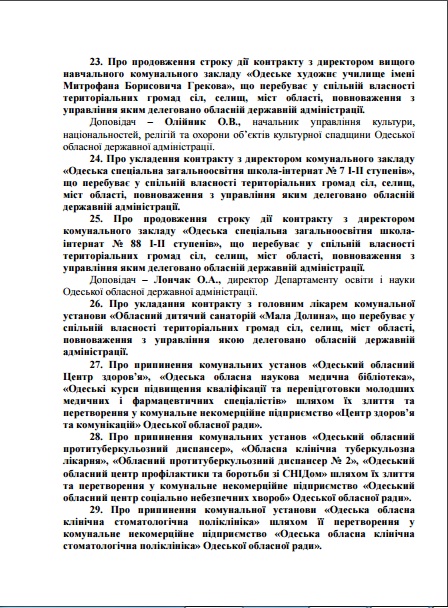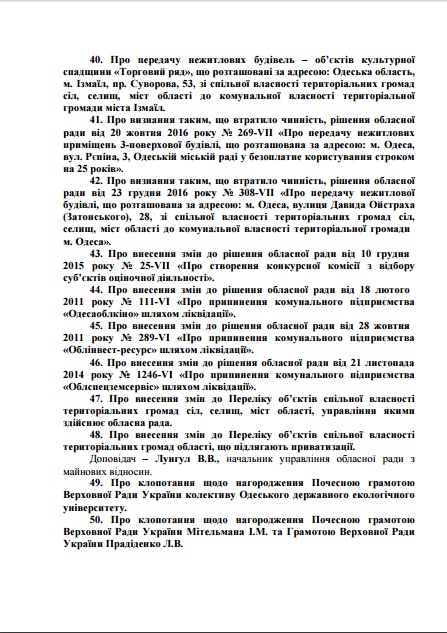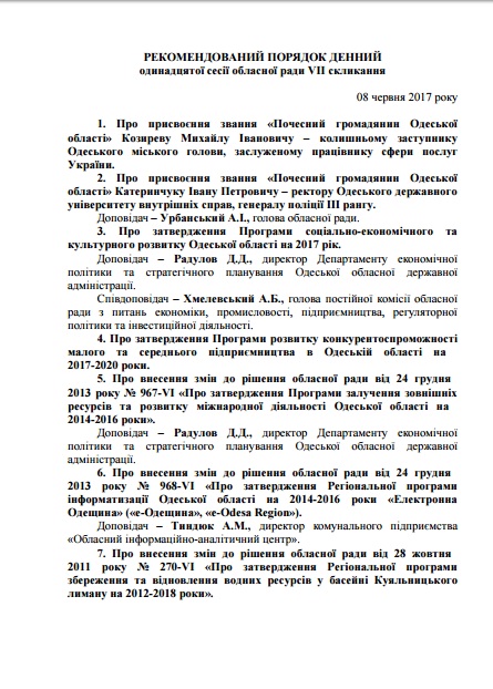 Согласно предварительной повестке дня, депутатам рекомендуется утвердить программу социально-экономического и культурного развития Одесской области на 2017 год, программу развития конкурентоспособности малого и среднего предпринимательства в Одесской области на 2017-2020 годы, внести изменения в решение областного совета от 28 октября 2011 года № 270-VI «Об утверждении Региональной программы сохранения и восстановления водных ресурсов в бассейне Куяльницкого лимана на 2012-2018 годы», а также в решение областного совета от 21 марта 2017 года № 355-VII «Об областном бюджете Одесской области на 2017 год» и другие вопросы.