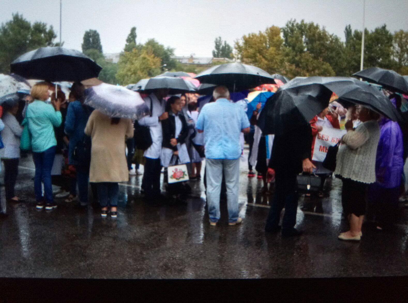 10:03 У входа в здание облсовета на проспекте Шевченко, несмотря на дождь, собрался митинг