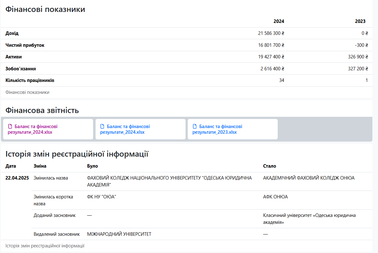 Правда, уже в апреле 2025 года частный колледж сменил название. Ну как название, скорее, слова в нем и теперь называется "Академический профессиональный колледж ОНЮА". Собственно аббревиатура здесь не расшифровывается даже в реестре юридических лиц, но легко прочитывается как "Одесская национальная юридическая академия".