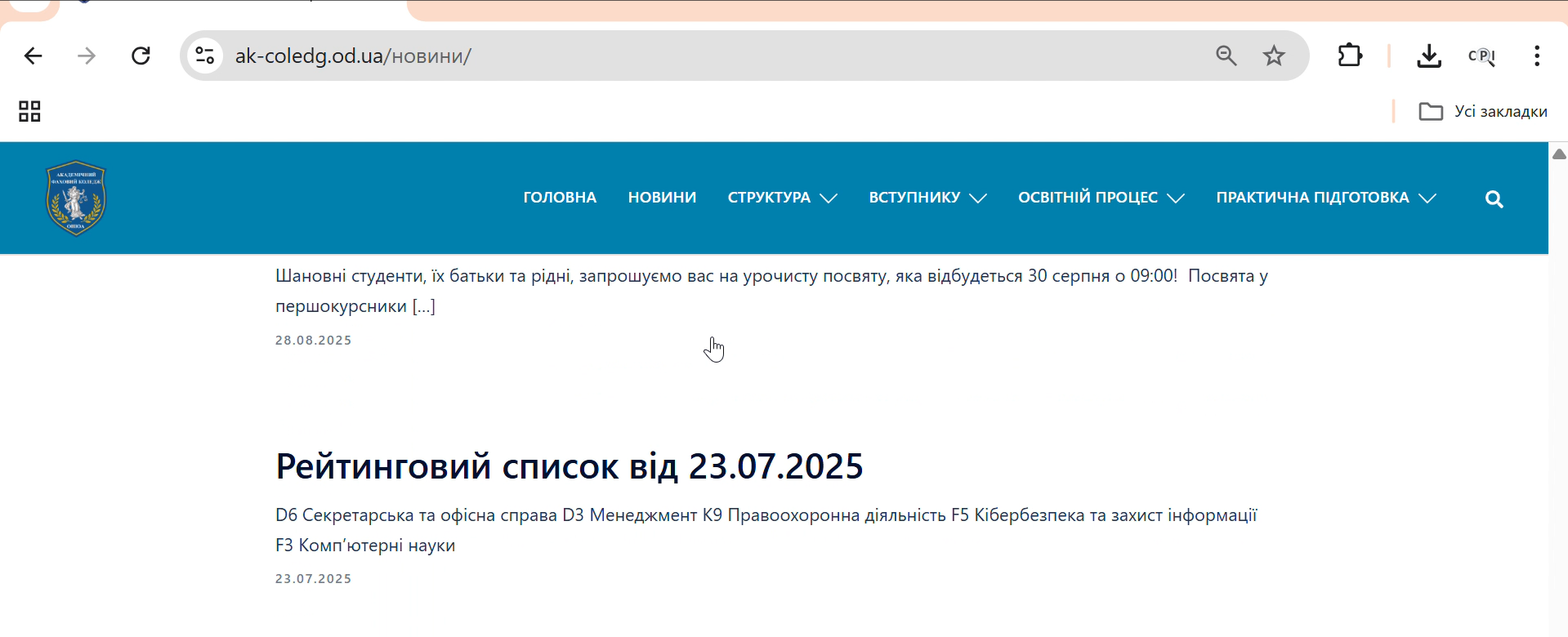 В ответ на запрос, руководство частного колледжа предоставило ссылку на новость "Важно! Разъяснение отдельных вопросов организации деятельности академического профессионального колледжа ОНЮА", которая якобы была опубликована 25.08.2025 года на сайте колледжа. Однако, когда Интент исследовал сайт частного колледжа ничего подобного не было: 23.07.2025 колледж опубликовал рейтинговый список, а 28.08.2025 - приглашение на посвящение первокурсников. Новостей или объявлений между этими двумя сообщениями не было. То есть разъяснение появилось на сайте задним числом и уже после обращения Интента.