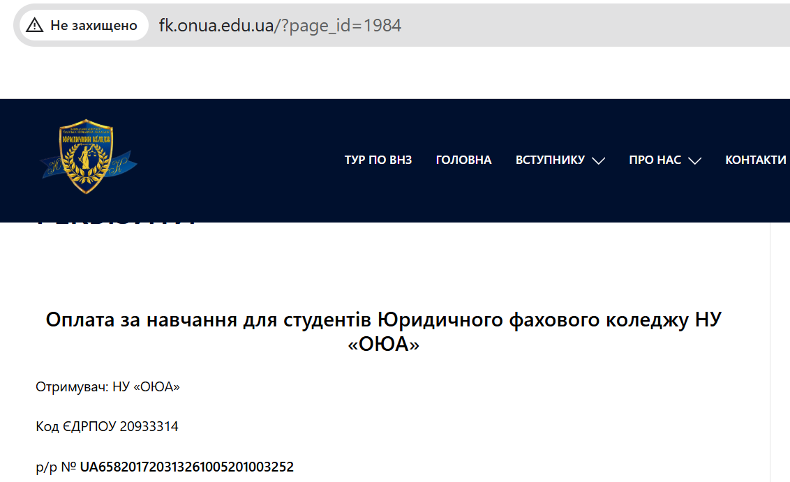 На сайте uk.onua.edu.ua были указаны реквизиты уже частного колледжа, а на сайтах fknuoua.od.ua, ak-coledg.od.ua вообще информации о реквизитах не было и нет.