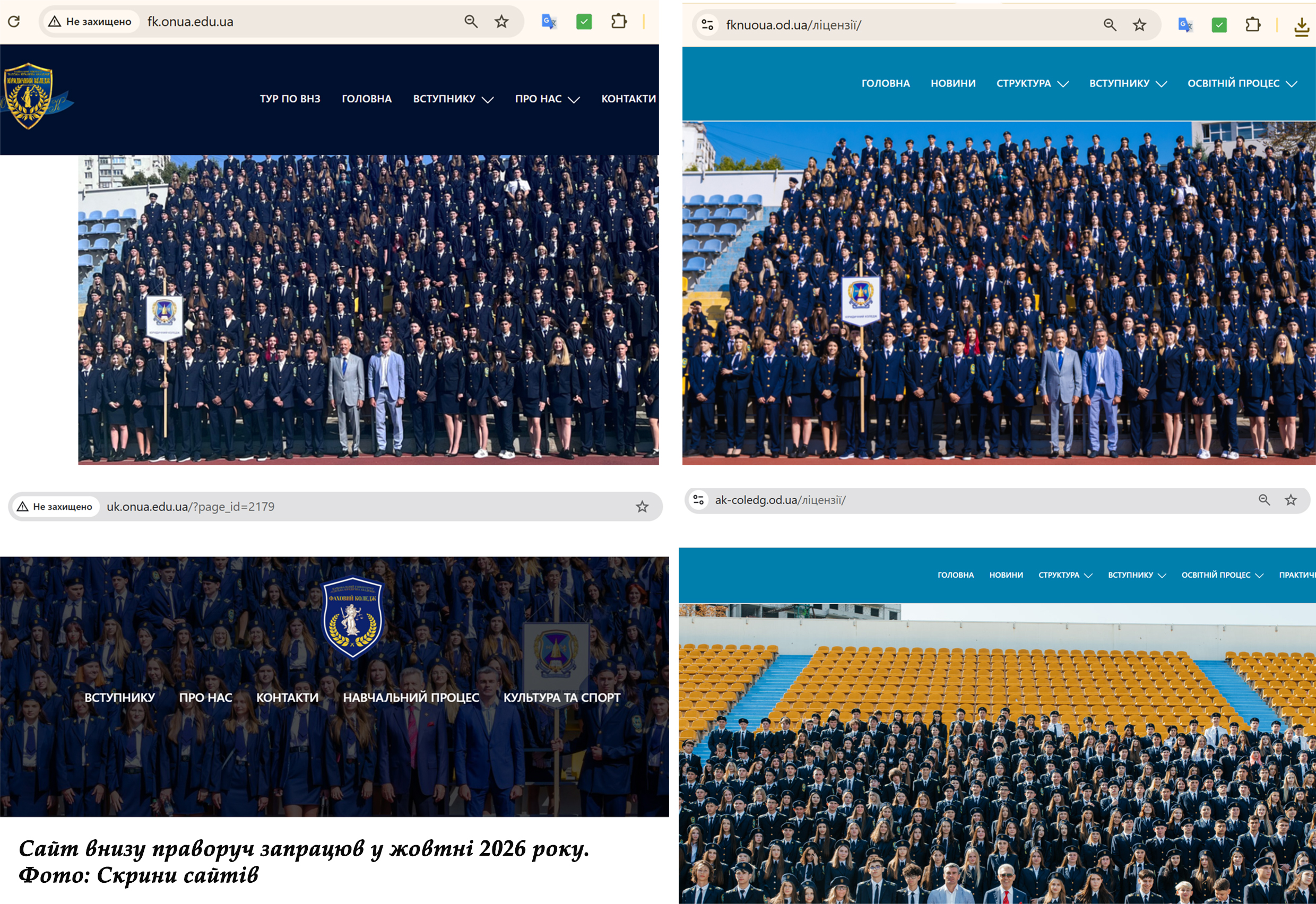 Однако по информации на сайте по адресу fk.onua.edu.ua мы увидели, что вступительная компания последний раз происходила в 2023 году, на сайте uk.onua.edu.ua набор был в 2024 году, сайт fknuoua.od.ua объявлял набор на 2025 год, а сайт ak-coledg.od.ua уже объявил набор на 2026 год.