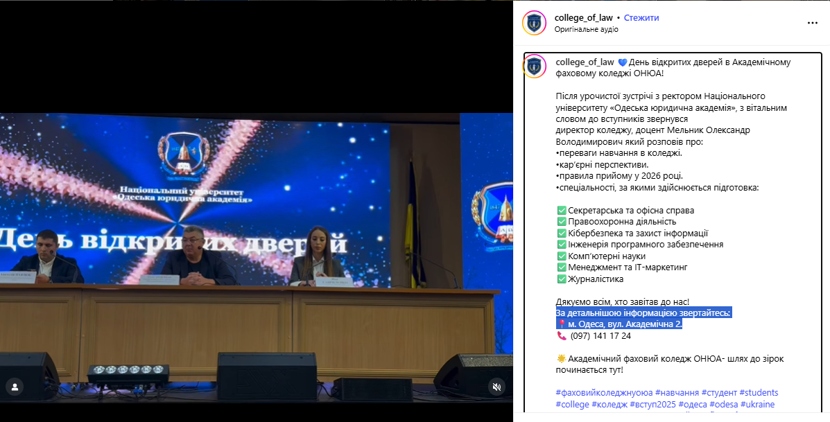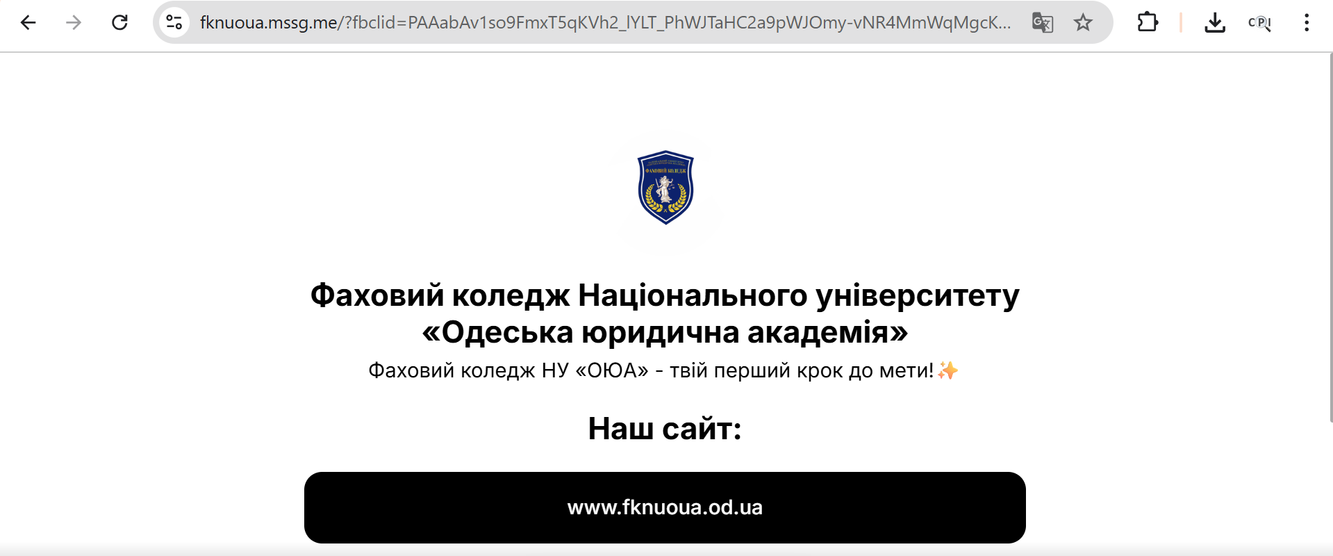 Кроме этого на сайте fknuoua.od.ua во вкладке "Абитуриенту 2025" перебрасывало на страницу соцсетей заведения, на которой было указано именно "Профессиональный колледж национального университета "Одесская юридическая академия".