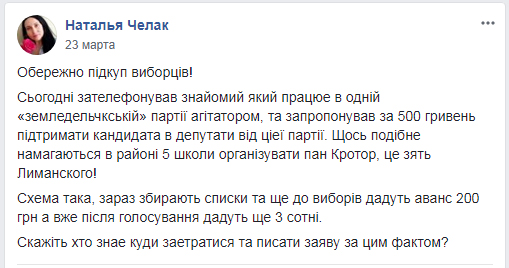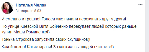 «По улице Киевской Витя Бойченко (ВО «Батькивщина». - Ред.) перекупает людей, которых раньше купил Миша Романенко (Аграрная партия. – Ред.)», – пишет пользователь Facebook под ником Наталья Челак.