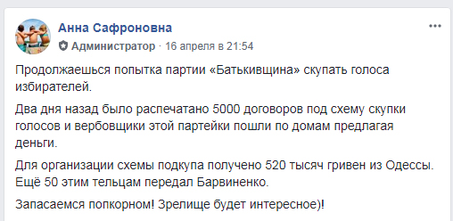 «Продолжается попытка партии «Батькивщина» скупать голоса избирателей. Два дня назад было распечатано 5000 договоров под схему скупки голосов и вербовщики этой партейки пошли по домам предлагая деньги. Для организации схемы подкупа получено 520 тысяч гривен из Одессы. Ещё 50 этим тельцам передал Барвиненко», – утверждает другой пользователь под ником Анна Сафроновна.