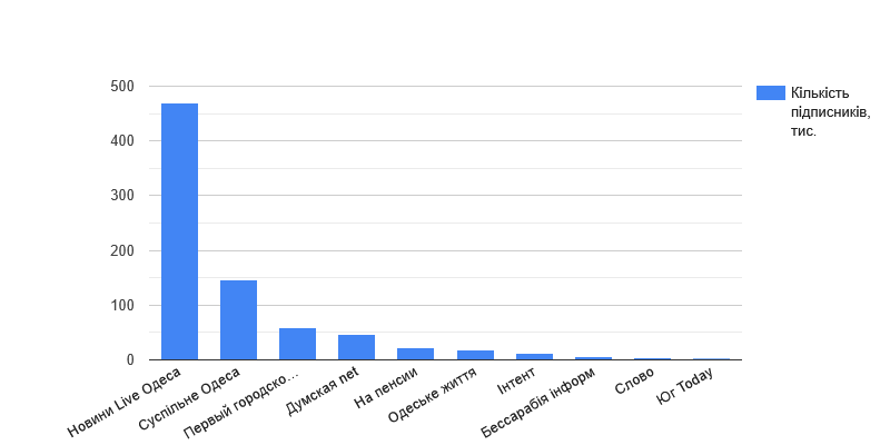 Как видно из таблицы, лидеры присутствия в YouTube - "Новости Live Одесса" и "Суспільне" - существенно нарастили количество подписчиков. Но самый стремительный рост продемонстрировали "На пенсии" (почти втрое), youtube Интент (более чем в 4 с половиной раза) и "Одесская жизнь" (примерно в пять раз).