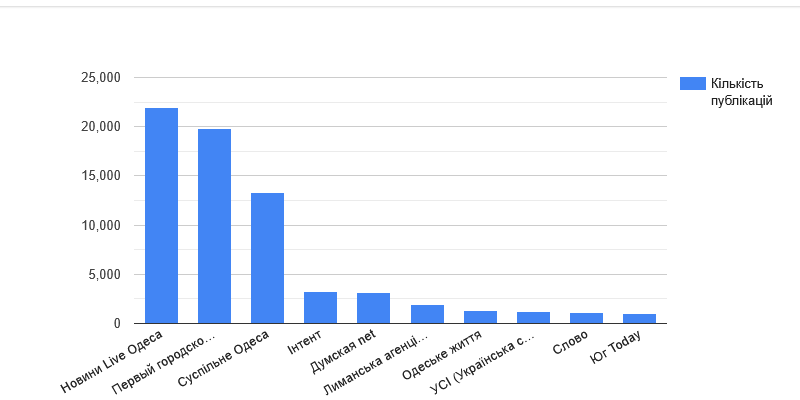 Выбытие двух телекомпаний, которые входили в тройку лидеров, - 7 канала и ТРК "Град" - серьезно сказалось на общей картине. Как и в случае с предыдущим показателем, по количеству публикаций на YouTube (почти 22 тысячи) первое место заняли "Новости Live Одесса". Вторую же позицию удерживает та же телекомпания, что и в прошлом году, - Первый городской канал. Из нетелевизионных медиа смогли прорваться в первую пятерку "Интент" и "Думская net".