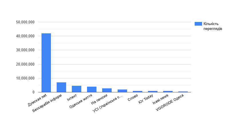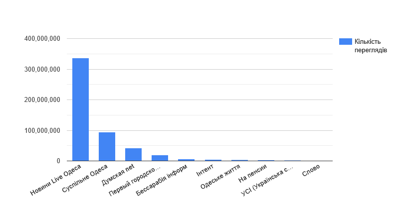 По этому показателю десятку лучших оставили 7 канал и ТРК "Град", которые не обновляются. Место "Града" на шестой позиции занял "Интент", который в прошлом году по этому показателю был последним в десятке, но с тех пор успел набрать более 4 с половиной миллионов просмотров. Также отметим, что по показателю "количество просмотров" разрыв между первой и десятой строчкой увеличился, если сравнить с прошлым исследованием: более 336 с половиной миллионов просмотров у "Новости Live Одесса" и чуть больше миллиона у "Слова".