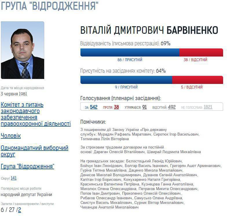 Виталий Барвиненко в процентном соотношении пропустил 50% заседаний комитета и 27% пленарных заседаний. Евгений Дейдей пропустил больше, чем Виталий Барвиненко, как заседаний комитетов (64%), так и пленарных заседаний (39%).