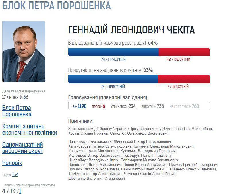 Посещаемость в процентном соотношении у Геннадия Чекиты пленарных заседаний и заседаний комитета: 20% и 45% соответственно.