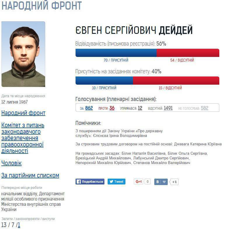 Членом этого же Комитета стал Евгений Дейдей. Нардеп также год возглавлял подкомитет по вопросам законодательства об административных правонарушениях. Евгений Дейдей пропустил 18 заседаний из 28.