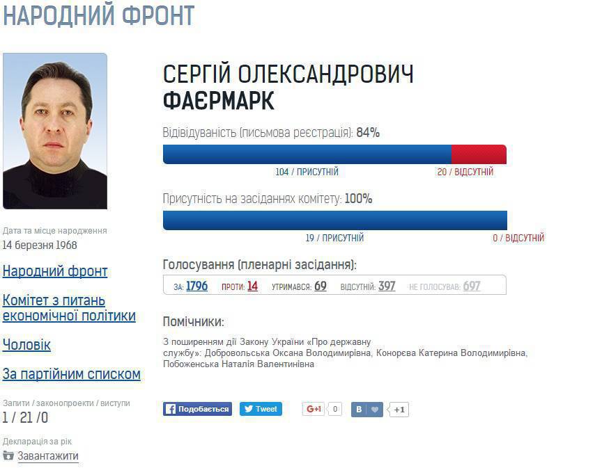 Сергей Фаермарк в Комитете по вопросам экономической политики возглавил подкомитет по вопросам хозяйственного законодательства, антимонопольной политики, развития экономической конкуренции. К 11 ноября состоялось 20 заседаний. У одесского нардепа - один пропуск. Сергей Фаермарк пропустил 5% заседаний комитета и 13% пленарных заседаний.