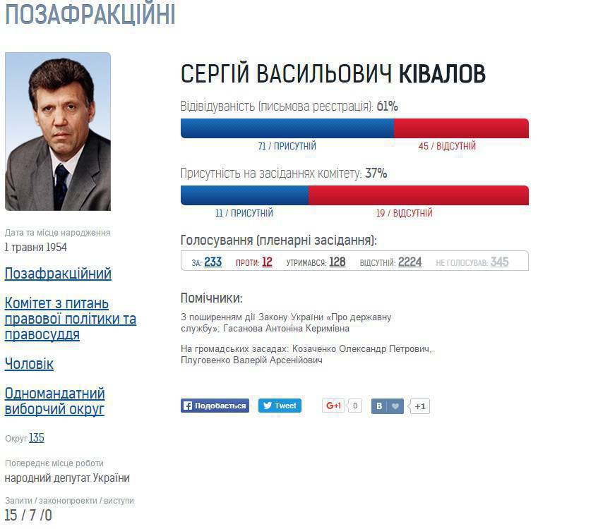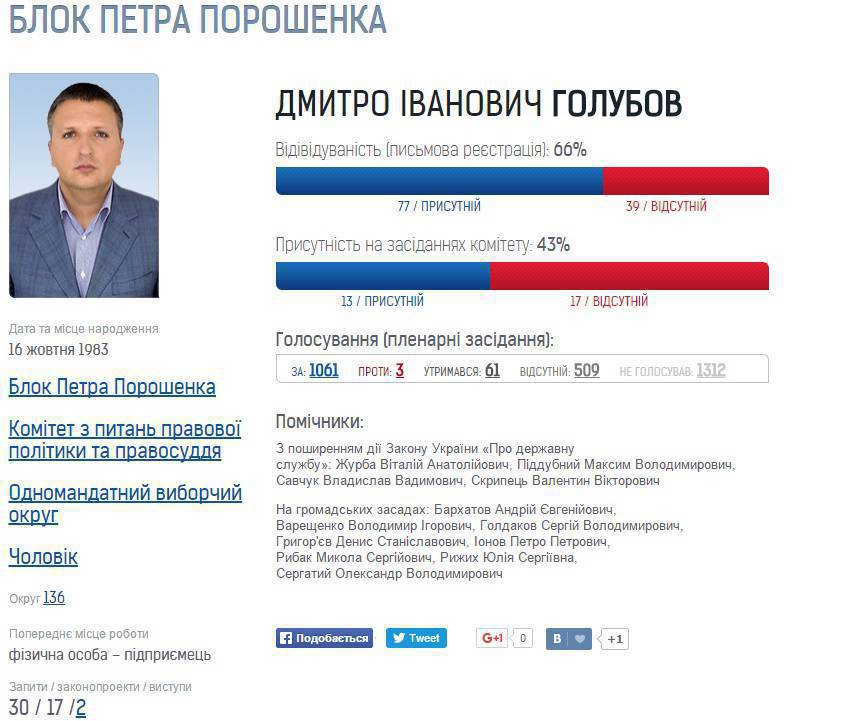 Дмитрий Голубов входит в тот же Комитет, в котором состоит и Сергей Кивалов, – по вопросам правовой политики и правосудия. Но нардеп от Суворовского района Одессы оказался несколько более дисциплинированным и пропустил половину заседаний Комитета – 18 из 37.