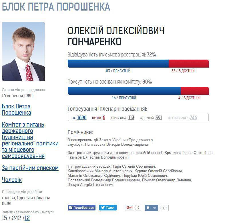 Алексей Гончаренко является секретарем Комитета по вопросам государственного строительства, региональной политики и местного самоуправления. Но посещение у Алексея Гончаренко не намного лучше, чем у Эдуарда Матвийчука – 4 пропущенных заседания из 20.