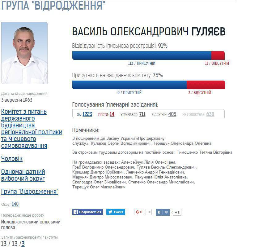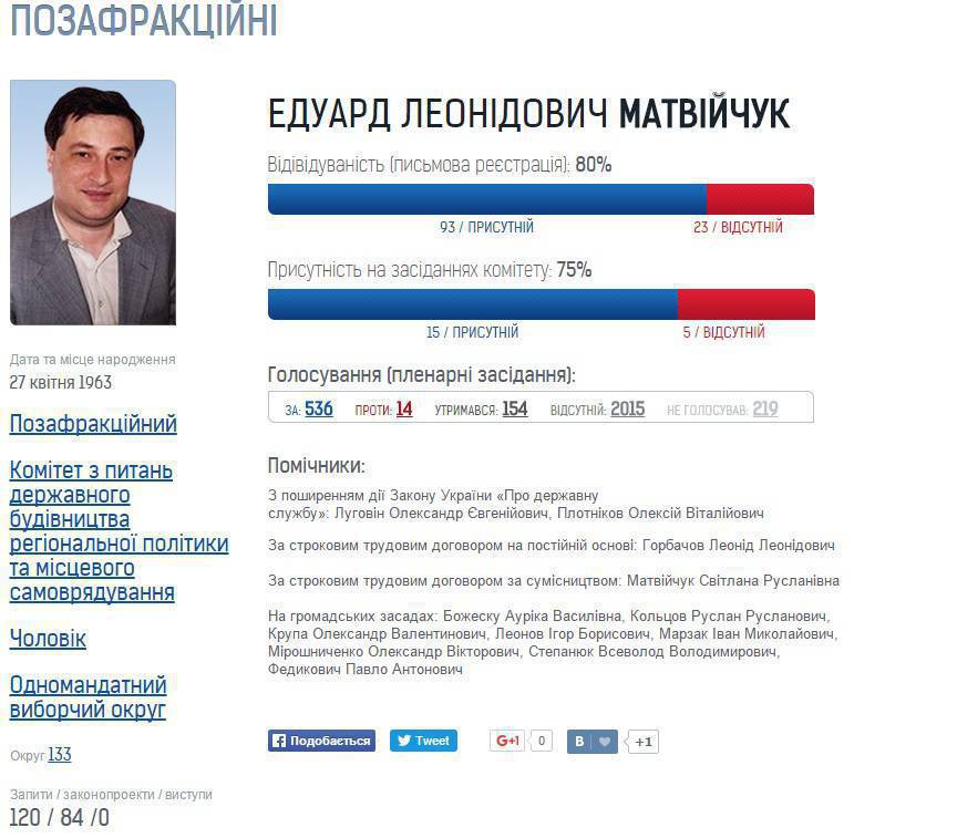 Если сравнивать в процентном соотношении посещение пленарных заседаний и заседаний комитетов, то Эдуарад Матвийчук пропустил 20% пленарных заседаний и 25% заседаний комитетов, Алексей Гончаренко – 18% и 20% соответственно и Василий Гуляев – 9% и 15%.