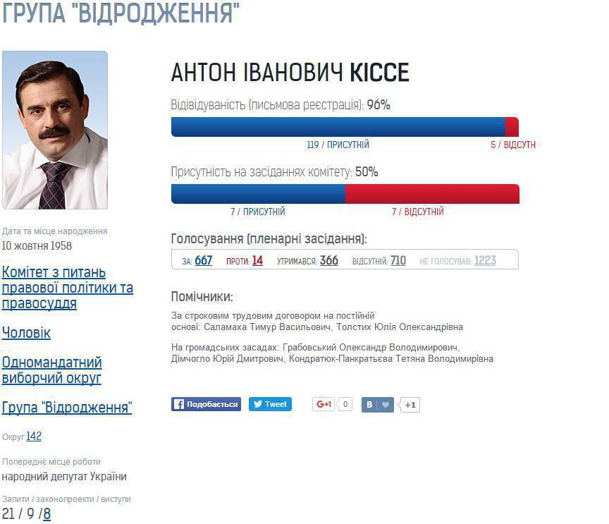 Антон Киссе и Дмитрий Голубов в процентном соотношении пропустили по 49% заседаний комитетов, а также 3% и 29% пленарных заседаний соответственно. Сергей Кивалов в процентном соотношении пропустил пленарных заседаний (31%) более чем в два раза, чем заседаний комитетов (68%).