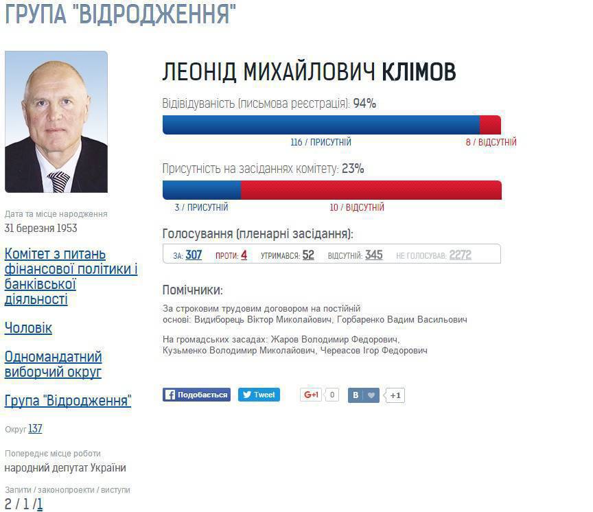 Леонид Климов из 29 заседаний Комитета по вопросам финансовой политики и банковской деятельности пропустил 20 заседаний.