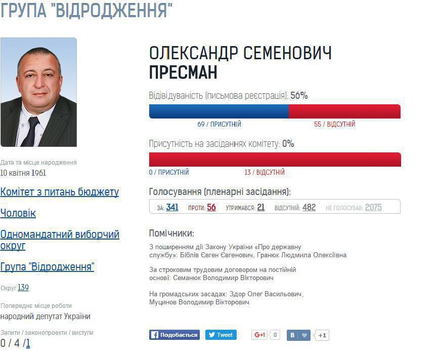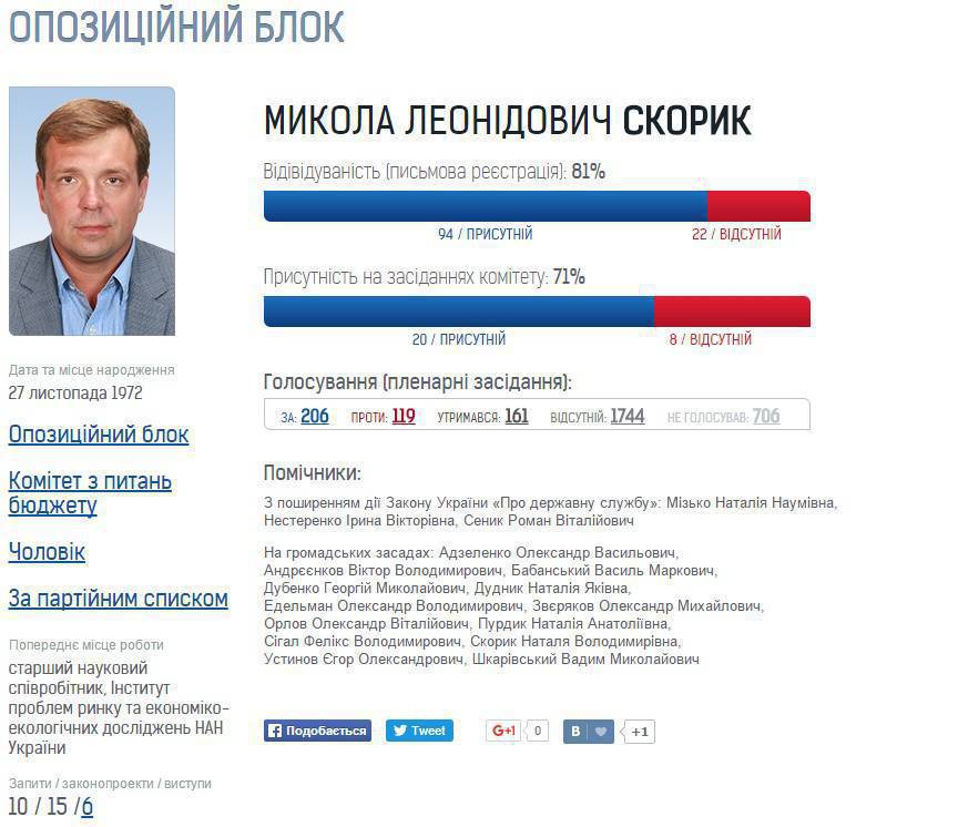 Николай Скорик и Павел Унгурян пропустили по 30% заседаний комитетов и 17% и 12% пленарных заседаний соответственно. Александр Пресман пропустил 47% заседаний Верховной Рады и все 100% заседаний комитета.