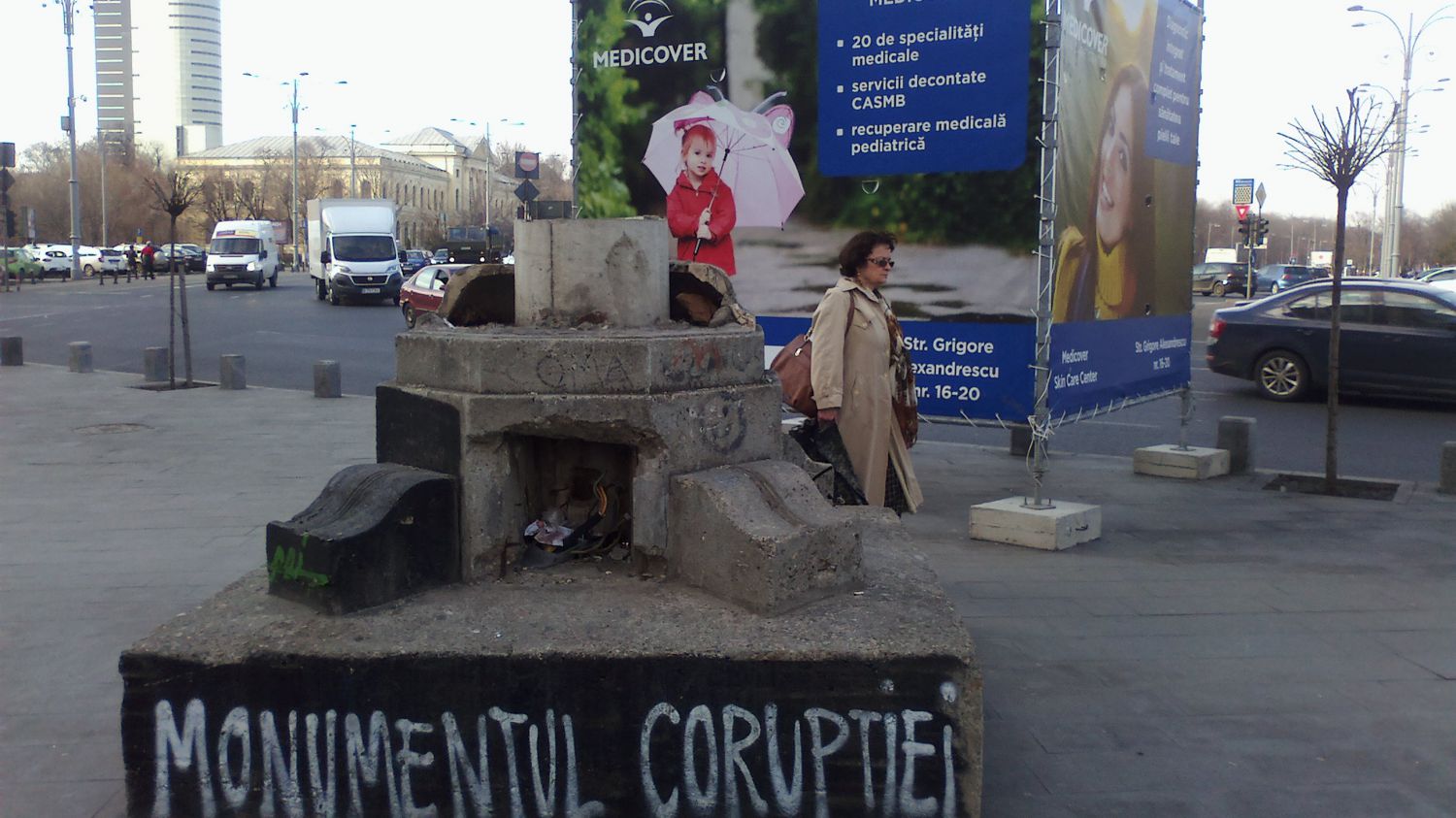 «Де-ми-си-а, де-ми-си-а!» - несколько голосов громко и отчетливо скандируют одно и то же слово много раз подряд. В пятницу днем на площади Виктория в Бухаресте не так многолюдно, как по выходным вечерами, однако протестующие поддерживают акции постоянно, сменяя друг друга на «боевом посту». Мы с собеседниками стоим возле так называемого «памятника коррупции» - остатки постамента, на котором баллончиком так и написано: «Monumentul corruptiei». Прямо перед нами – та самая площадь, названная так в честь победы над турками в 1878 году, и ставшая символом сегодняшних протестов против правительства и коррупции в целом. Здесь же расположен и дворец Виктория, где находится официальная резиденция премьер-министра. Начиная с 31 января здесь постоянно собираются активисты – то сотни, то тысячи и даже сотни тысяч. На площади ведут отсчет дням протеста, например, 3 марта – 33-й день митингов.