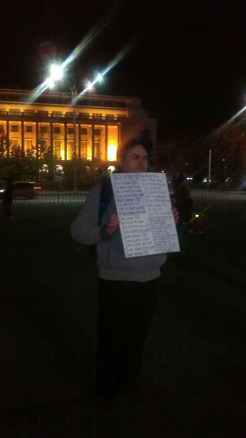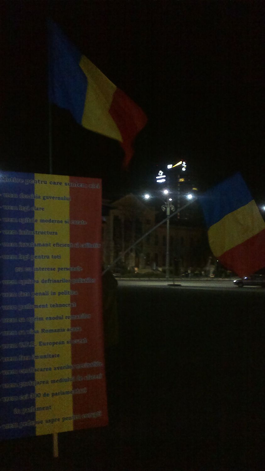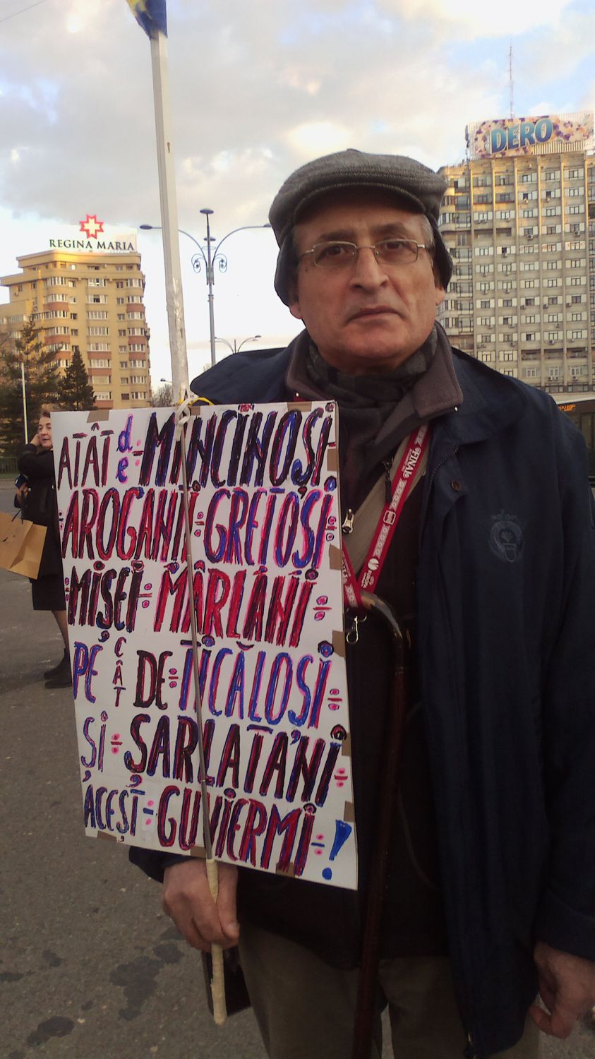 «Так и передайте потом в Украине. Чтоб вы не повторяли наших ошибок. Всех коммунистов и социалистов надо изгонять сразу. Мы вот своих не выгнали. Я знаю, вы думаете, что мы Чаушеску расстреляли, и на этом коммунизм закончился. Ничего подобного, у нас коммунисты остаются при власти фактически. У нас люстрации, как в Прибалтике, не было. И вот что мы видим? Что ПСД (Партия социал-демократов. – Ред.) теперь пытается нас обмануть, пытается вытащить на свободу своих соратников, которых Лаура посадила (глава ДНА Лаура Ковеши. – Ред.). Нет, правительство надо отправлять в отставку, иначе ничего хорошего не будет», - говорит пенсионер, который приходит на площадь Виктория каждый вечер. И добавляет: «Из Румынии на заработки и поиски лучшей жизни уехали 4 миллиона человек. Я не хочу, чтоб мой сын так же уехал, как они. Хочу, чтобы здесь было хорошо, чтобы у власти были порядочные люди».
